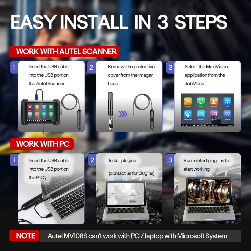 The MaxiVideo MV108S digital inspection camera is designed to work with MaxiSys series products (except Autel MaxiSys MS906) or PC. It turns your MaxiSys tablet into a video inspection scope, allowing you to examine difficult-to-reach areas normally hidden from sight. It is capable of recording digital still images and videos, which offers you an economical solution to inspect machinery, facilities, and infrastructure in a safe and quick way.